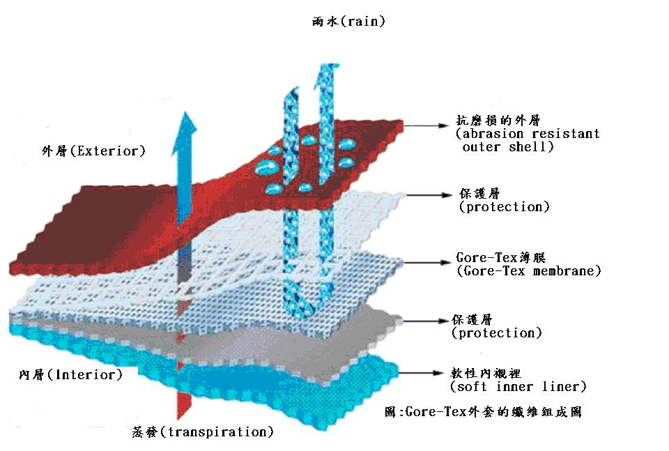 一般的雨衣通常有兩層,外層通常是尼龍或聚酯纖維,能提供較佳的張力,內層為聚胺甲酸酯(PU)能防水及透氣。Gore-Tex織品是用一層薄且多孔透氣的聚四氟乙烯取代內層的PU材質,其每平方英吋有90億個小孔(大約每平方公分有14億個小孔),這些小孔大約是小水滴的二萬分之一,因此液態的水滴無法滲入但水蒸氣分子可透出。