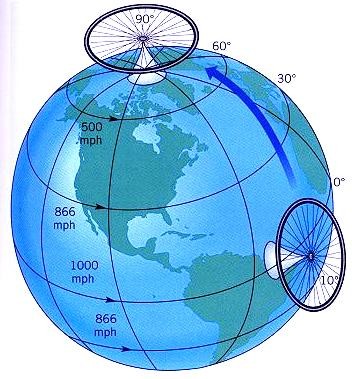 於本文第二段有言「在北半球愈往北走地球水平旋轉轉速愈大(到了北極便和地軸轉速一致)由圖中看出赤道地區的自轉轉速為100 mph、中緯度為866 mph、高緯度地區為 500 mph,以地球自轉轉速而言,赤道地區自轉轉速應最大,緯度越高越低。文字與圖是否有些出入呢?