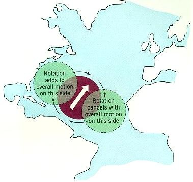 當一團原本並末轉動的海水(棕色部份)向北移動時,由於上述之效應,這團海水相對於地球應逐漸呈現順鐘向旋轉,其左側部份因旋轉所產生之流速與整體運動方向相同,右側則相反,故愈往北移其左側流速將愈快,這就是造成西邊強化現象主要的原因。