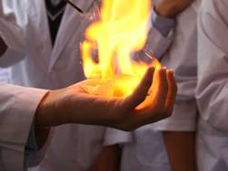 2. 彎折一張閃光紙成碗狀,再倒立地放置於一隻手的手掌心,另一隻手以線香點燃此閃光紙,使其於手掌心瞬間燃燒,如圖十一和圖十二所示。