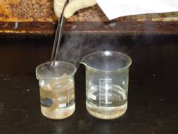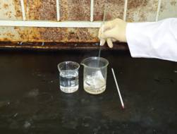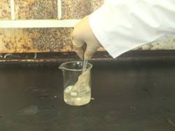 3. 當混合酸溫度下降至40℃左右時,取五張秤量紙,然後浸入混合酸中。用玻璃棒壓下秤量紙,確保整張的秤量紙完全浸入混合酸中,如圖三所示。