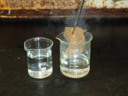 4. 準備一個裝約7分滿水的250 mL燒杯,放置在通風櫥中。以鑷子夾出浸泡適當時間的秤量紙(請參閱「教學提示」的第一項),放到此燒杯中,如圖四和圖五所示。