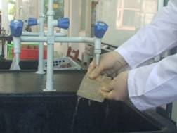 5. 移出含秤量紙的燒杯到水龍頭旁,取出秤量紙在水龍頭下輕輕地沖洗,並且充分地洗掉殘留的混合酸,如圖六所示。