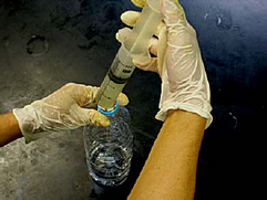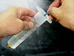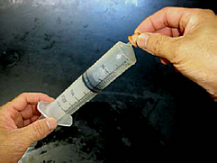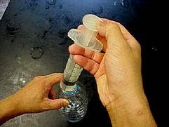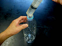 4. 插入針筒推桿(活塞)到注射筒內,先手持注射筒使開口朝上,取下注射筒橡皮塞,推進針筒推桿,以排除空氣。然後放置於一個保特瓶的瓶口,推進針筒推桿,以排除大部分的水,避免殘留空氣,如圖三所示。