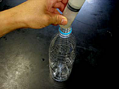 6. 在反應完全後,卸下橡皮塞。放置此注射筒於一個保特瓶的瓶口上,排除未反應的稀鹽酸,保留氫氣在注射筒中,如圖五所示。