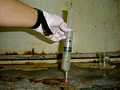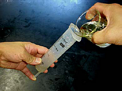 5. 拉起注射筒的針筒推桿,吸取約20 mL的1.0 M HCl,如圖四所示,並迅速套住橡皮塞。此時開始發生反應而產生氣泡,立即手持注射筒橡皮塞朝下並壓住桌面,使之緊密連接在一起,以避免氣體從注射筒的開口處逸出。隨後反應快速發生,針筒推桿會往外推開。
