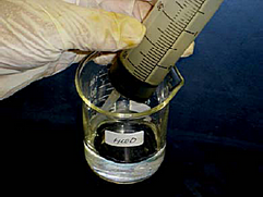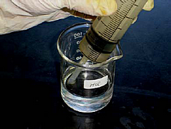 3. 手戴乳膠手套,以避免接觸次氯酸鈉漂白水(NaOCl溶液)。先吸取約5.0 mL的3%次氯酸鈉漂白水,如圖九所示。