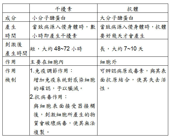 干擾素與抗體皆為蛋白質,同時具有防禦病毒感染、調節免疫力的功能,但其產生的時間及作用機制有所不同,其比較如下: