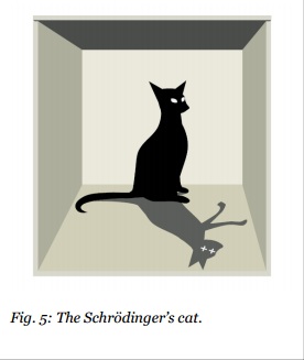 量子物理學的核心問題,就是在於量子與古典物理學之間要如何轉換。這個問題可用廣為流傳,叫做「薛丁格的貓」(Schrödinger’s cat) 的矛盾加以闡述。這個名稱是指薛丁格在一九三五年所提出的一個想像實驗,用來強調要把量子力學的概念應用到日常生活中有多困難(見圖五)。他提出的問題是:隨著時光流逝,一個量子系統要到什麼時候,才會從一個既有的重疊態變成另一個?自從量子力學在一九三〇年代產生以來,許多物理學家就一直在鑽研量子物理學與古典物理學的界限(詳見祖瑞克 (Zurek) 在一九九一年發表的論文,以及雷格特 (Leggett) 等人在一九八七年的文獻回顧)。