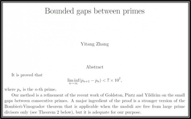 在講述張益唐不凡的一生前,先談談他今年四月投稿在數學年刊《Annals of Mathematics》的一篇論文“質數間的有限間距”《Bounded gaps between primes》。在這篇論文中,他首次證明了無窮多的孿生質數對,其差小於七千萬。