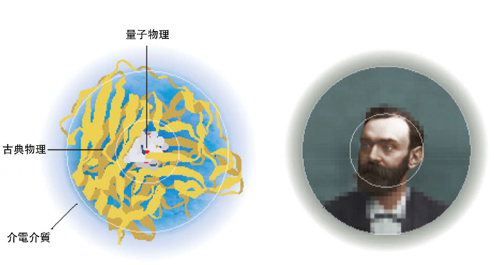 現在的計算中,科學家還在模擬時加入了第三個層次。簡單的來說,電腦可將離化學反應中心很遠的原子們包裹在一起,成為一個均勻的質體,在科學圈內,這被稱為介電介質(dielectric medium)。