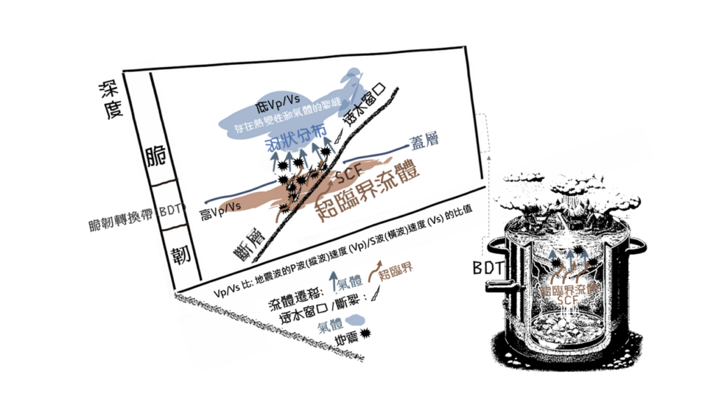 若以壓力鍋的比喻來說明,地殼下介於BDT區域中有一個壓力鍋蓋(蓋層)封住超臨界流體。但這個壓力鍋蓋子並不完美,中間有裂縫(斷層)通過,形成一個「透水窗口」。鍋蓋下方因高溫高壓,促使流體向上遷移通過「窗口」。當超熱、超高壓的流體從窗口噴湧而出時,壓力會突然下降。流體瞬間變成氣體。這就像打開香檳酒瓶塞一樣,溶解的二氧化碳瞬間變成了氣泡。滲透窗口上方具有低P / S波速度比 (Vp / Vs) 的羽流狀區域,表明了相變產生的熱改變地層和氣體的釋放。因此在此壓力鍋區域附近引發相關的地震活動,而從研究的3D可視圖中,亦可知地震都聚集在「透水窗口」附近。