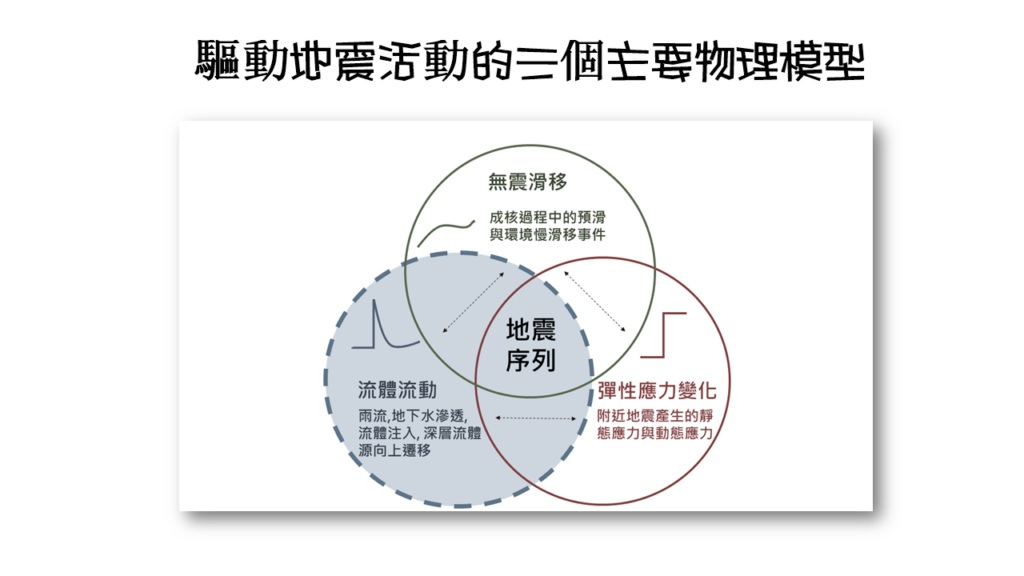 這些案例研究表明,流體不論來自地表上方或下方,均是斷層帶的變數。Peng & Lei (2025) 將引發地震的物理機制分為三大類(圖四):