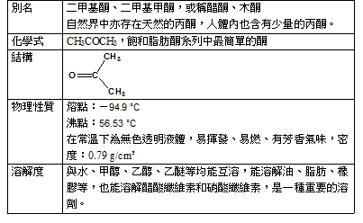 1.古時候以石灰中和木材乾餾所得的木醋液或工業上製得乙酸得到乙酸鈣,熱裂解(160℃)乙酸鈣(Ca(C2H3O2)2)可得丙酮和碳酸鈣