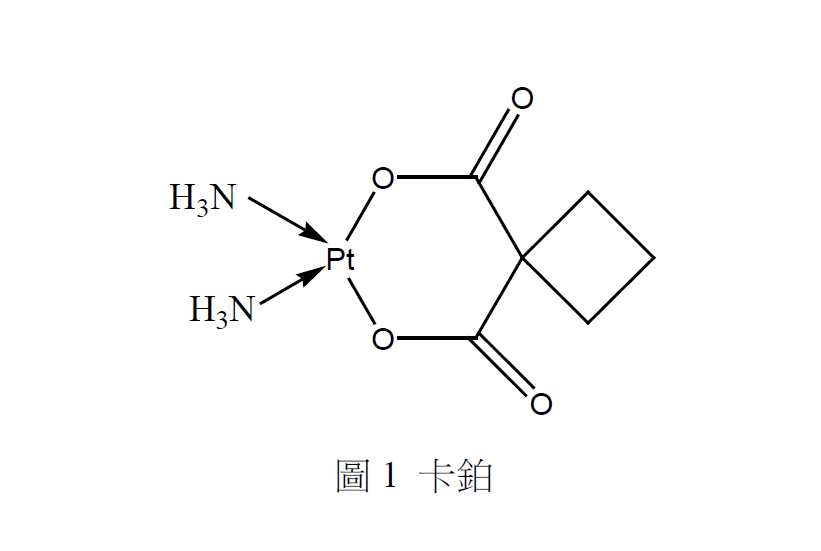 卡鉑的結構如圖1,此化合物是用來治療某些癌症(主要是卵巢癌、肺癌、頭部及頸部的癌症)的化療藥劑。在1980年後段開始引用以來,由於與順鉑比較起來,副作用較少,因此被廣泛用於治療。順鉑與卡鉑均屬於含鉑抗癌藥物,會和DNA交互作用,干擾DNA的修復。