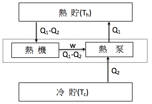 接者我們以圖解的方式來驗證違反凱文-普朗克的說法,是不是也同時違反克勞修斯的說法。首先我們假設有一部違反熱力學第二定律的熱機,能將熱貯所吸取的熱量$$(Q_1-Q_2)$$,並完全對外做功$$(w)$$,不需對冷貯排熱,其裝置詳如圖二的左半部。