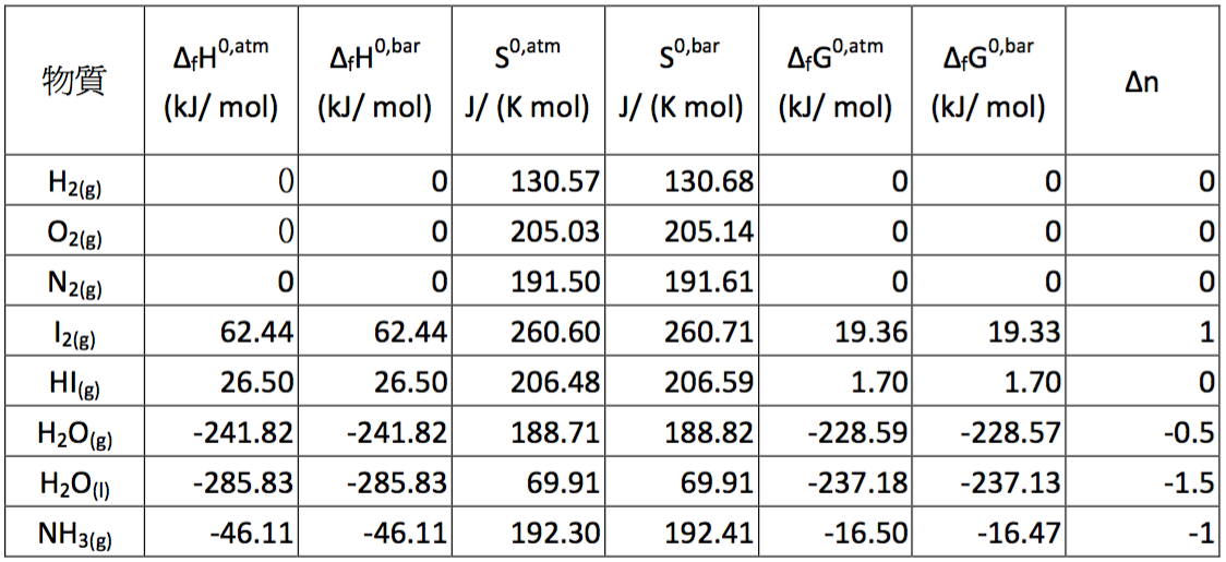 由上表可知,若非作精密計算,基準壓力小幅的改變,對莫耳生成自由能的差異,其實影響甚小。表三中物質的熱力學數據是以 $$1~atm$$ 做為標準壓力,再經公式轉換成以 $$1~bar$$ 為基準,若將此計算得出的數值,直接和物化教科書3上相對應的查表數值相互比較,其相對熵的部分計算值和查表值相差不到萬分之 $$2$$,至於莫耳生成自由能的部分,也小於千分之 $$2$$,基本上若考慮不準度的因素,兩者實際上是相等的,因此上述公式的推導是合乎邏輯的。