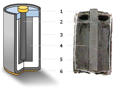 鋅碳電池,又稱鋅碳乾電池、碳性電池、碳性電芯,外殼由鋅構成。第一個商用乾電池是由法國科學家勒克朗社(G. Leclanché, 1839-1882)所發明,電池的陽極是鋅罐。陰極是一支碳棒(石墨棒),碳棒是惰性電極,只作為電子的通路,本身沒有直接參與化學反應。兩電極之間填滿了氯化銨(NH4Cl)為電解質、二氧化錳(MnO2)和氯化鋅(ZnCl2)的飽和溶液以及一些惰性漆料濕漿糊(圖1)。當電極被連接時,陽極的鋅即被氧化就失去電子(e–)。失去的電子便經由電線跑到陰極,使NH4Cl中解離出的NH4+離子還原成NH3,同時也形成氫氣。釋出的氫再被二氧化錳所氧化,而NH3則被利用形成錯合物Zn(NH3)2Cl2。
