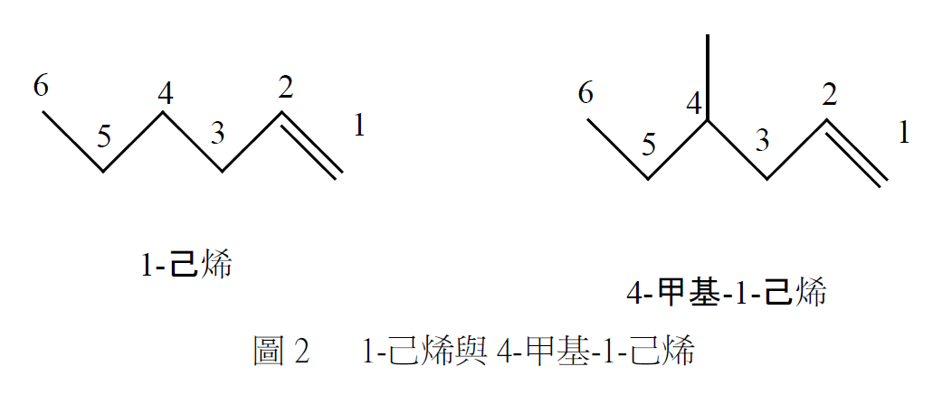 要注意的一點是,主鏈必須包含雙鍵,像圖3的烯,其中有一段碳鏈其實含有六個碳原子,然而因為含雙鍵的最長碳鏈只含五個碳原子,所以仍應以戊烯作為主鏈,其餘碳鏈只能視為取代基。此外,在此例中有甲基及乙基兩種不同取代基,若依IUPC命名法,各取代基必須根據英文字母順序排列,乙基(ethyl)應排列在甲基(methyl)之前,但在中文命名中,不同取代基之排列順序不以英文字母決定,而是以取代基碳數少的排列在前面,所以甲基應排列在乙基之前。