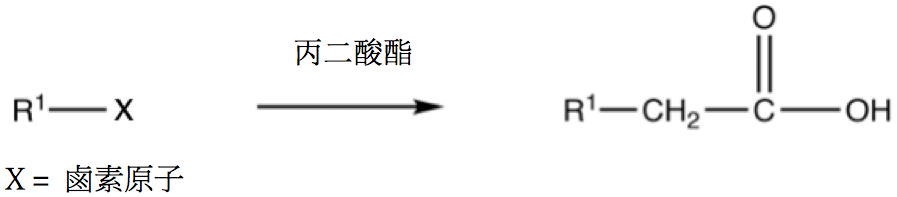 丙二酸酯合成法是一種有機合成法,將鹵烷類化合物轉變為羧酸化合物並增加兩個碳原子。是利用丙二酸酯(1)$$\alpha$$ 位置上有酸性較大的氫(2)易發生脫羧反應等兩大特性。