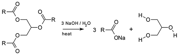 動物脂肪和植物油主要成份是由長鏈脂肪酸(fatty acids)和甘油所反應而成的酯類。這些三酸甘油酯(triglyceride or triacylglycerol)經過水解反應會產生甘油和脂肪酸鹽。因為脂肪酸鈉鹽是離子化合物, 如果濃度很低時,它是溶在水中的(實際上可溶,因為他們可形成微胞的形式溶在水中),但是如果高濃度的脂肪酸鈉鹽,它會聚集在一起而凝集形成了肥皂。基本 上,酯類的水解反應被稱為皂化(saponification),其反應式如圖一所示,其中R為長鏈的飽和或不飽和的烴基。