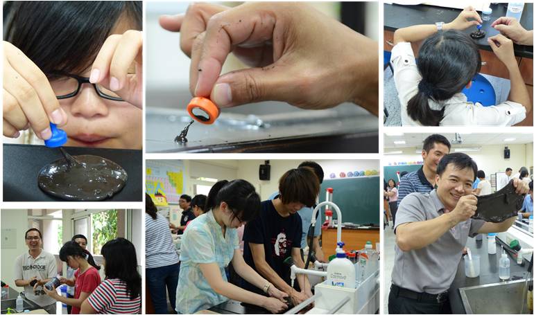 透過教育部化學學科中心種子教師工作坊培訓活動、化學闖關教師工作坊以及縣市夥伴的研習,「製作磁力異形」有機會推廣與分享到全國各高中,如中山女高、竹山高中和高雄中學等學校,約有250位化學教師參與磁力異形的製作工作坊,並且獲得多數老師的贊同與肯定;除此之外,磁力異形亦應用於高三學生有機高分子的實驗教學,深受學生喜愛。分享「製作磁力異形」工作坊的活動照片,如圖一所示。