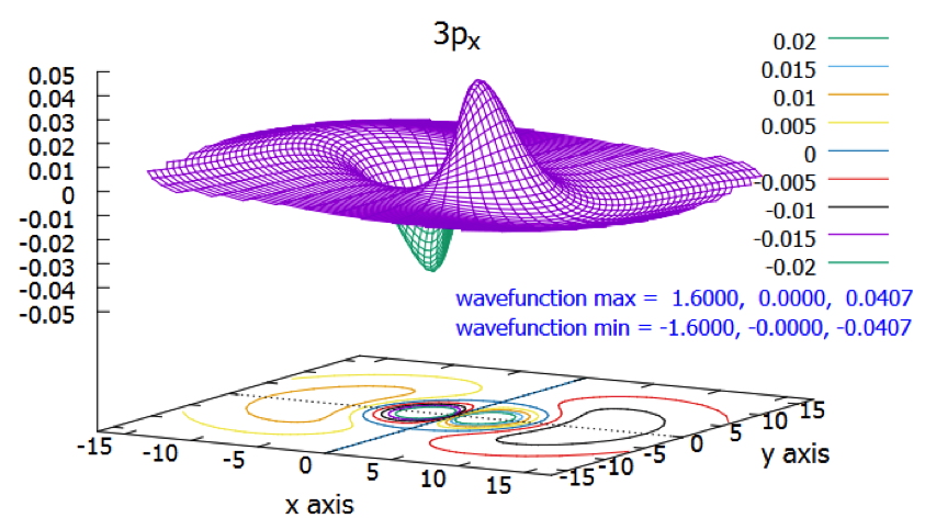 圖四中 $$z$$ 軸即為 $$3p_x$$ 波函數的值,由圖中可看出其值有正亦有負,正值代表在 $$xy$$ 平面上方有凸起的部分,有一個山峰及一個較平緩的小山丘,凹下去的部分為負值,有一個深的山谷及一平緩的小山溝。
