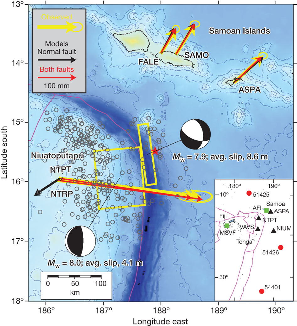 圖一 2009年9月29日發生在東加海溝的兩個地震。左下方為隱沒帶地震的震源機制解(逆衝斷層),右上方為海溝外側隆起地震的震源機制解(正斷層)。黃色箭頭代表GPS觀測站所測量到的地表位移量,黑色箭頭代表利用正斷層模擬出的位移量,紅色箭頭則代表加入逆斷層後所模擬出的位移量。
