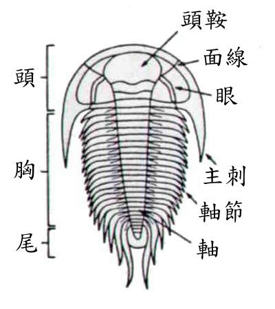 三葉蟲的名字就是根據它的外部形狀而來,不論縱看或是橫看都是三葉。橫向看是由頭至尾分成「頭甲」(cephalon)、「胸部」(thorax)、「尾甲」(pygidium)三部。若由縱向來看,則可分為中央的「軸部」(Axis)和兩側的「肋部」(Pleural lobe),而大小自 5 公釐(Agnostus)到700公釐(Uralichusribeiroi)不等。但若說到三葉蟲的內部構造,目前我們所知的非常少,因為生活環境的關係,能夠成為化石而保存下來的,只有硬的甲殼部分,由目前化石上見到的一些器官和肌肉組織,可以指出他們的相關位置,卻無法知道確切的功能。下面就從三葉蟲的頭部開始介紹起: