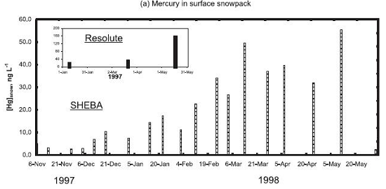 由全球海氣交換的汞通量Foa可知,Foa主要由「海表元素態汞 Hg0 濃度」與「海表溫度」決定,而極區長期處於低溫狀態,故極圈的汞通量平均而言,呈現出由大氣沉降到海洋的型式。而 Julia 2001 的研究報告指出﹝測量1995至1996年﹞,每年沉降進入北極海的汞通量為 5.6-7.8 μg / m2‧year;而在春、夏季的融雪期有最大的平均值 300 ng / m2‧day。