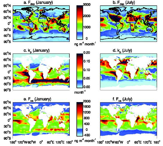 全球海水內的溶液態汞物質,分布的特性將決定於三個因素:當地的沉降型式、基礎生產力、湧升流;而其中生物生產力的多寡將影響到二價汞 Hg11 還原成元素態汞 Hg0 的速率,以及不易反應汞 Hgnr 的逸散速率。