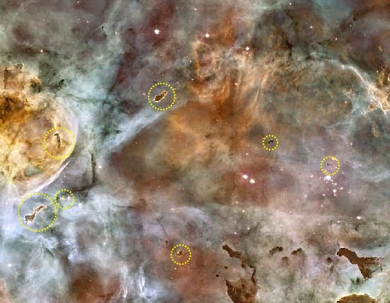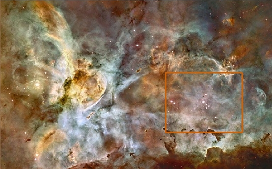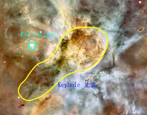 船底座星雲位於船底座,距離地球約7500光年遠。由於許多恆星在此誕生和死亡,使得星雲形狀極為狂亂。船底座星雲有許多質量巨大的恆星,這些恆星的質量甚至是太陽的100倍以上,以致其發出強烈的光芒將周圍的氣體都加熱而發光,下圖為中間偏左區塊放大後,黃色的圓圈為大質量恆星