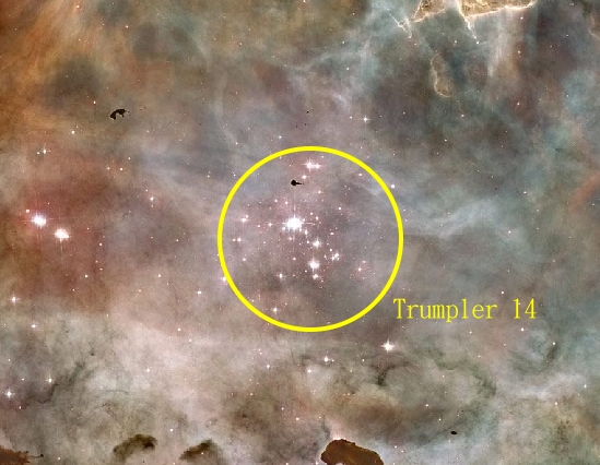 大約300萬年前,成團狀的星際氣體和塵埃發生坍陷而形成星雲中的第一群恆星,有些恆星聚集成群,圖中為Trumpler 14星團