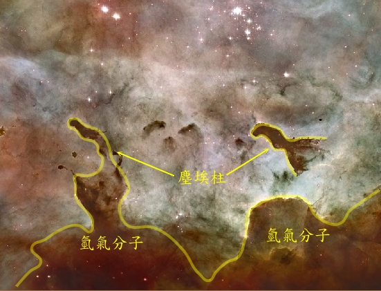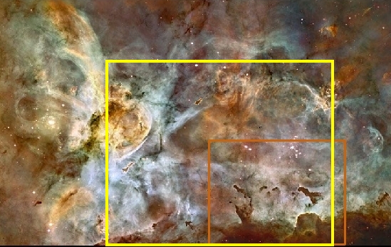 兩個黑暗的塵埃柱狀塔在成蔭的氫分子雲上方,彎曲的塵埃柱不斷受到來自附近大質量恆星所發出強烈輻射的侵蝕;在這些濃厚星雲的內部,恆星正在誕生,只是視線被遮蔽了。如果將上上圖的黃色區塊放大觀察