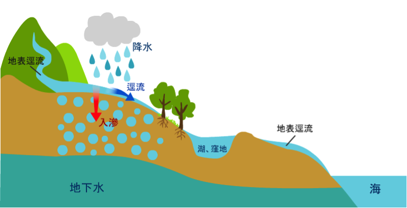 雨水降至地表後,扣除因蒸發或遇到窪地、湖泊等攔截的損失,一部分的水會滲入到地表下,進入更深層則成爲地下水,隨著坡度在地下流動,另一部分因土壤水分達飽和而未入滲的超滲降水,則在地表上流動,稱為「地表逕流」或「漫地流」(Surface Runoff),我們眼見河川裡流動的河水就是地表逕流(圖一)。而各地水文測站測得每單位時間通過的河水體積,則為河川的「流量」(Flow Rate)。