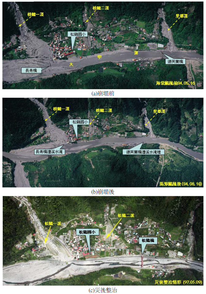 豐沛雨量使南部山區產生大量地滑及土方崩塌,造成交通道路中斷形成孤島效應,威脅當地居民生活財產,更嚴重地,主流河道淤積使原先河道通水斷面(Cross-Section)容許通水量大幅下降,加上支流沖積扇阻塞了主流河道,而形成堰塞湖(圖2),因此必須利用快捷的空間量測方法,蒐集劇烈地形地貌變化資料,以作為後續地形監測分析之用。