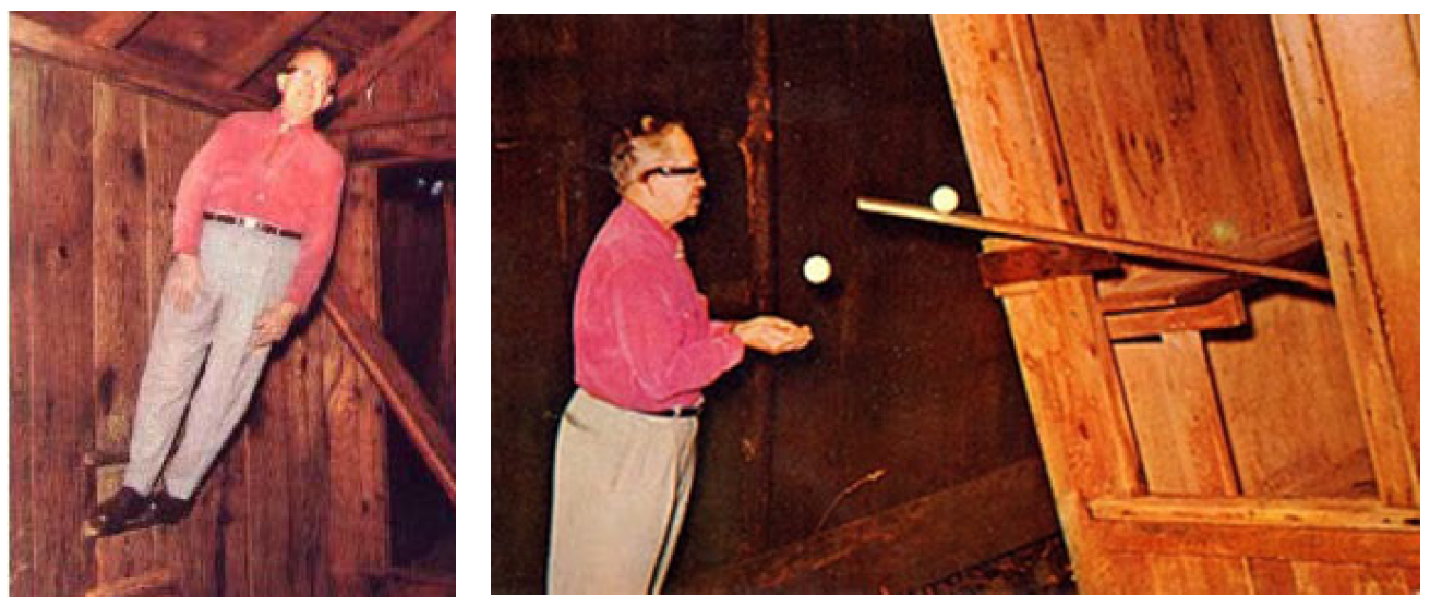 另外,美國加州聖塔柯斯鎮(Santa Cruz)郊區有個神奇小木屋,人們在裡頭可以輕易站上牆壁或看見球向坡頂滾動等奇異現象,被人們稱作Mystery Spot(見圖三)。