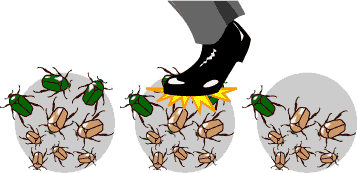 在小族群中,特殊等位基因的出現頻率可能偶然地發生徹底的改變,某些等位基因可能全部由少數幾個個體攜帶,如果這些個體未能成功繁衍子嗣,便使得這些等位基因意外地遺失。如圖一中意外被踩死的綠色甲蟲,使得綠色甲殼的等位基因在這個小族群出現的頻率下降(意外地),這種等位基因頻率發生隨機變化,如同頻率漂變,即稱為遺傳漂變(genetic drift)或是等位基因漂變(allelic drift)。綠色甲蟲的例子是將問題過度單純化,現實中更多等位基因頻率的改變是不會表現在生物的外觀上,所以遺傳漂變其實一直都在發生。