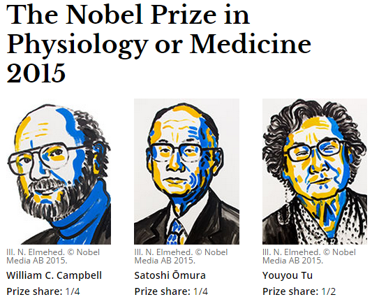 2015年諾貝爾生理醫學獎桂冠,一半共同頒給坎貝爾 (William C. Campbell)博士與大村智教授(Satoshi Ōmura),因他們發現對抗寄生蟲-線蟲(roundworm)感染的神奇治療法;另一半頒給發現對抗瘧疾神奇治療法的屠呦呦教授。寄生蟲疾病長期讓人類蒙受痛苦,並成為全球主要健康問題。河盲症(River Blindness)最終會導致不可逆的失明。淋巴絲蟲病(Lymphatic Filariasis)會引發慢性腫脹,導致一生外表難看及失能的臨床症狀,如象皮病(Elephantiasis)與陰囊積水(Scrotal Hydrocele)。瘧疾的病源體是單細胞寄生蟲-瘧原蟲(Plasmodium)所引起,藉由瘧蚊叮咬而傳播, -瘧原蟲會入侵紅血球,引起發燒,嚴重會造成腦部發炎而導致死亡。