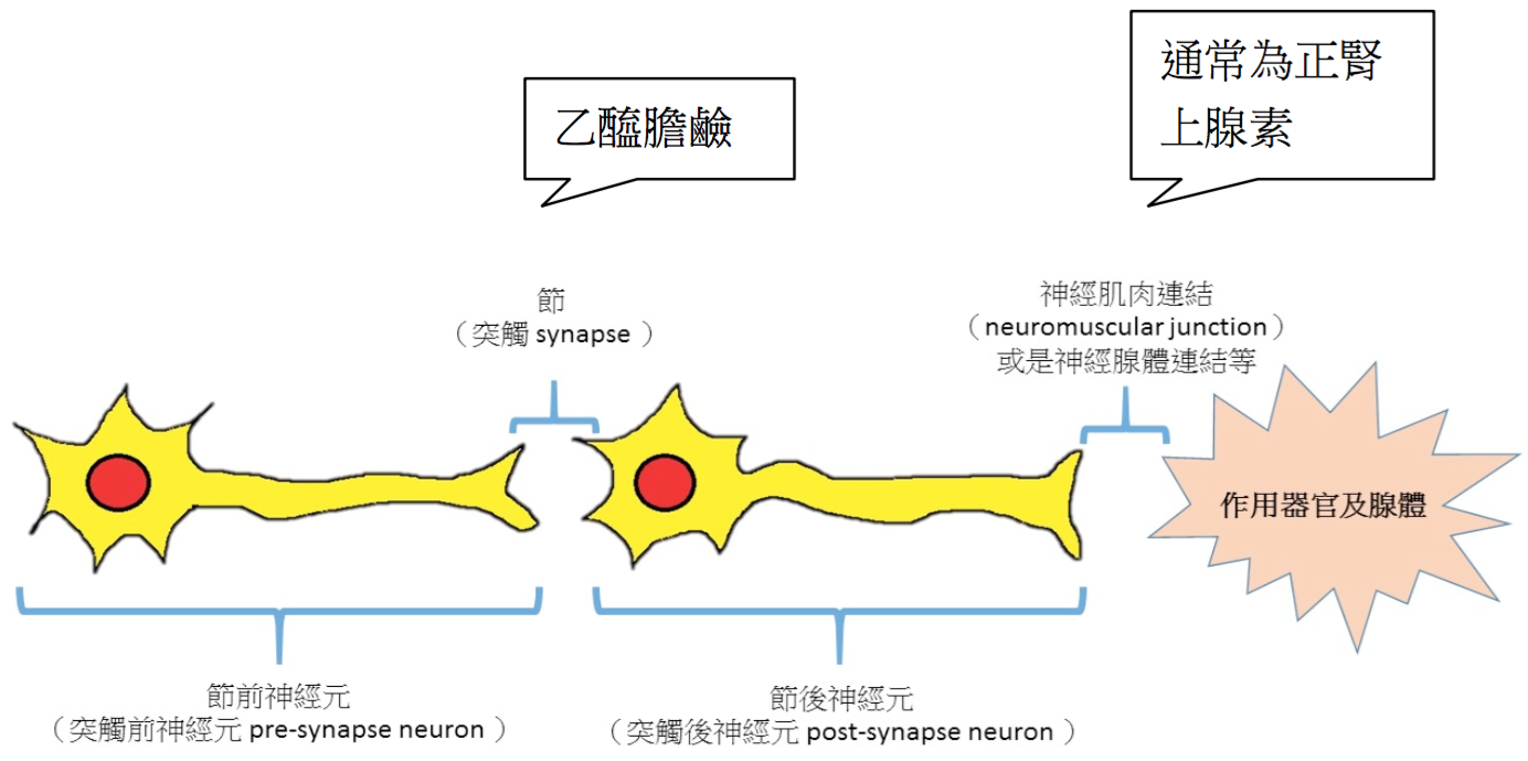 此外周邊神經系統中,許多神經元間的傳導也使用乙醯膽鹼作為神經傳導物質,包括運動終板、交感與副交感的神經的節前與節後神經元間,以及副交感的節後神經元與作用器官間的傳導。很多人認為乙醯膽鹼作為副交感活性的神經傳導物質,但是事實上,引發的打或逃 (fight or flight) 反應的交感活性,其節前與節後間的傳導一樣是乙醯膽鹼(圖一)。