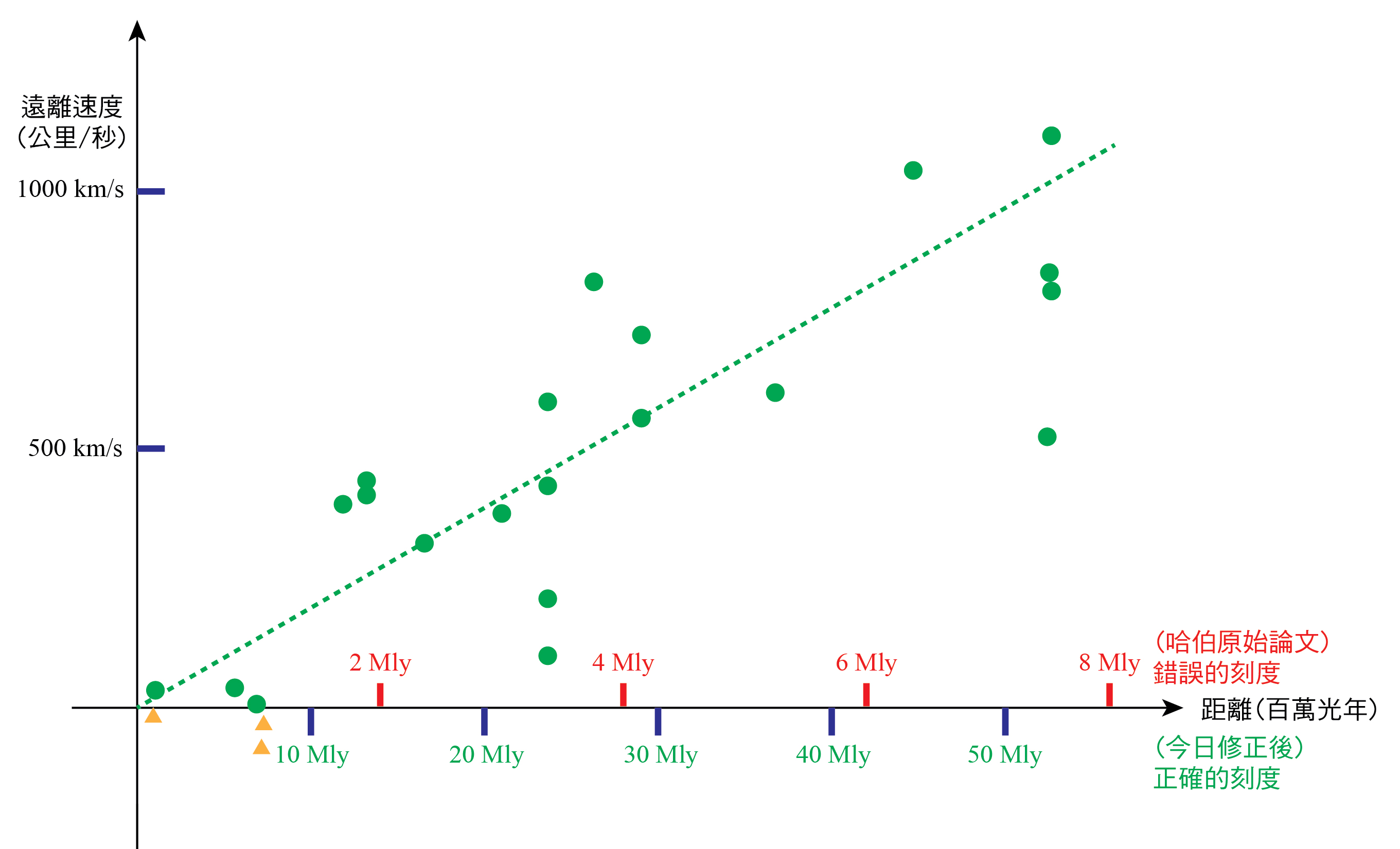 哈伯 (Edwin Powell Hubble, 1889-1953) 在 1929 年整理了前人以及自己的觀測資料,以不同星系相對於太陽的遠離速度當成縱軸,把星系相對於我們的距離當成橫軸,畫出了類似圖一的結果(這是將哈伯原始數據重新繪製,原因詳見後述)。這些數據點看起來相當散亂,在一般的實驗中,我們可能不會很有信心地以線性函數去做近似,但考慮到天文觀測的諸多不確定性,哈伯仍大膽地以一條直線(圖一綠色虛線)去描述這些數據間的關係,並將之詮釋成遠方星系都在遠離我們,且其遠離速度與星系和我們之間的距離成正比。後來所謂哈伯定律 (Hubble’s law) 指的便是這個關係。