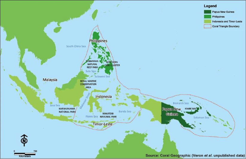 臺灣位於熱帶與亞熱帶之間,由於有黑潮流經,海水溶氧充足且水質佳,緊鄰全球海洋海洋生物多樣性最高的菲律賓-馬來西亞-印度尼西亞珊瑚三角地帶(The Coral Triangle,圖十一),使得臺灣的海洋生物多樣性極高:臺灣擁有全世界 10% 的海洋生物物種,其中包含全世界 40% 的珊瑚種類。臺灣本島除了西岸為泥質與沙質海岸不利珊瑚幼體固著之外,南臺灣、北海岸、東海岸以及各離島海岸沿線都可以看見珊瑚的蹤影。整體而言,以臺灣南部的小琉球、墾丁國家公園與恆春半島、澎湖群島、東部的綠島、蘭嶼等離島海域有十分豐富的珊瑚礁相,反之,其他地區的珊瑚礁分布較為零星,種類也較少。還有遠在南海的東沙群島與南沙群島因位處熱帶,加上少有人為干擾,因此周遭海域有極高的珊瑚多樣性。