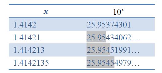右欄中灰色底的位數代表與精確度較低的 $$x$$ 相較之下仍相同的位數,這些數字不再隨 $$x$$ 的準確度改變,就能確定是和 $$10^{\sqrt{2}}$$ 相同的數字。因此我們可以確定 $$10^{\sqrt{2}}=25.9545…$$。若我們將這個列表無限延伸下去,$$10^{\sqrt{2}}$$ 的數值也能無限延伸下去。任意規定一個需要準確的位數(一個正整數的小數點下位數),這個可以無限延伸的表格,總有達到要求的時候。