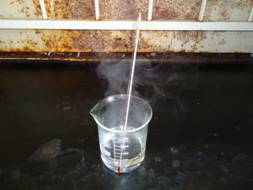 2. 在通風櫥內準備一個500 mL的燒杯,小心地倒入100 mL新鮮的濃硫酸到125 mL新鮮的濃硝酸,此時溫度會上升至70℃左右,如圖二所示。