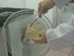 7. 取出浸泡藥用酒精的秤量紙,用電風扇加速吹乾,如圖八所示。吹乾的秤量紙即為閃光紙,用塑膠密封袋密封保存,袋內的空氣盡可能排除。