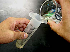 3. 手戴乳膠手套,以避免接觸次氯酸鈉漂白水(NaOCl溶液)。先吸取約5.0 mL的3%次氯酸鈉漂白水,如圖九所示。