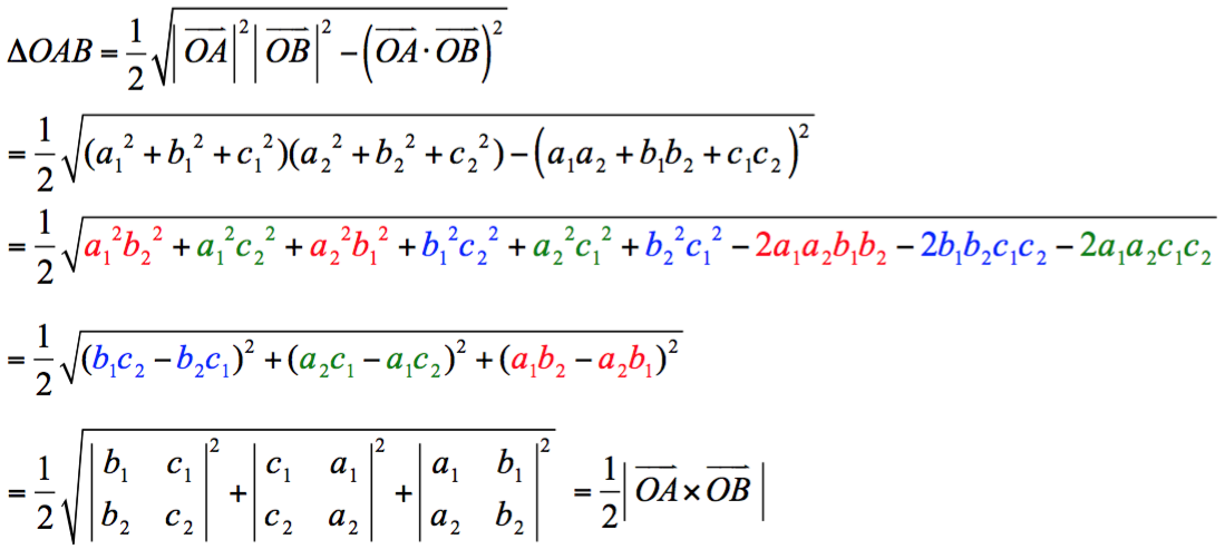 則 \(\Delta OAB\) 面積 \(=\frac{1}{2}|\vec{OA}\times\vec{OB}|= \frac{1}{2}\sqrt { {{\left| { \begin{array}{*{20}{c}} {{b_{ 1}}}&{{c_{ 1}}}\\ {{b_{ 2}}}&{{c_{ 2}}} \end{array} } \right|}^2} + {{\left| { \begin{array}{*{20}{c}} {{c_{ 1}}}&{{a_{ 1}}}\\ {{c_{ 2}}}&{{a_{ 2}}} \end{array} } \right|}^2} + {{\left| { \begin{array}{*{20}{c}} {{a_{ 1}}}&{{b_{ 1}}}\\ {{a_{ 2}}}&{{b_{ 2}}} \end{array} } \right|}^2}} \)