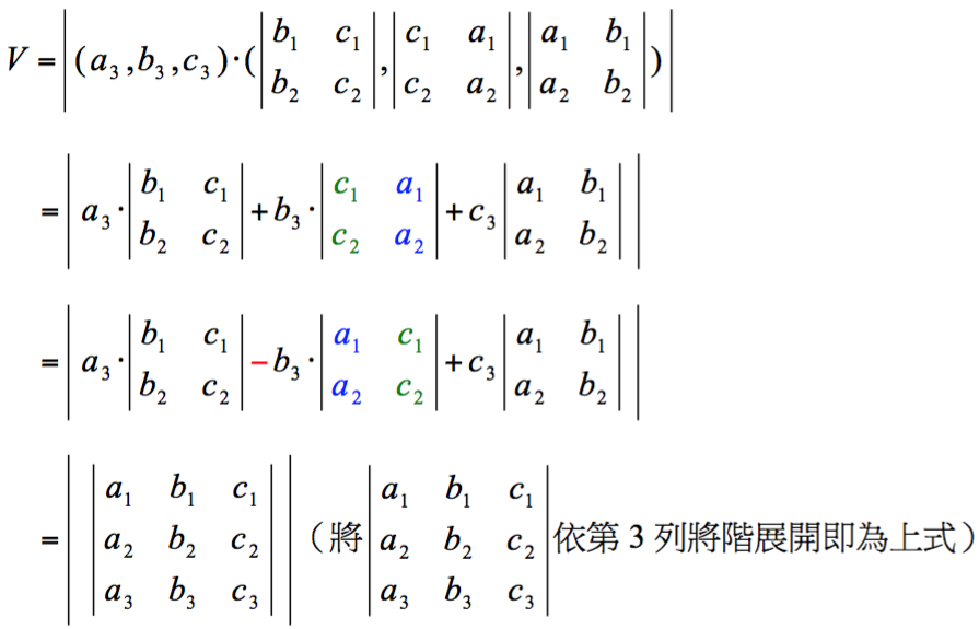 等號左邊其實就是 \(\left| { \begin{array}{*{20}{c}} {{a_{ 1}}}&{{b_{ 1}}}&{{c_{ 1}}}\\ {{a_{ 2}}}&{{b_{ 2}}}&{{c_{ 2}}}\\ {{a_{ 3}}}&{{b_{ 3}}}&{{c_{ 3}}} \end{array} } \right|\) 依第 \(3\) 列降階展開的結果,