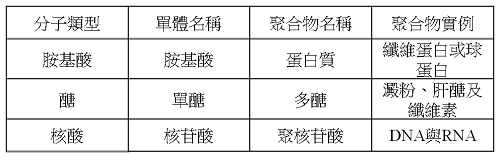 構成動物、植物與微生物的大部分組織是由三類基本分子組成:胺基酸、醣和脂質(通常稱為脂肪)。因為這些分子是生命不可或缺的,代謝反應主要的工作,即在建構細胞與組織時製造這些分子,或在消化與利用食物時,將這些分子分解,並以其作為能源。許多重要的化合物可以結合在一起,製造如DNA和蛋白質等聚合物。這些巨分子是所有生物體必要的物質,下表中列出了一些最常見的生化聚合物。