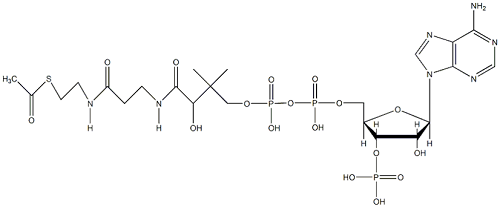 圖4 輔酶乙醯Co-A的結構。在分子最左端,可轉移的乙醯基鍵結在硫原子上。